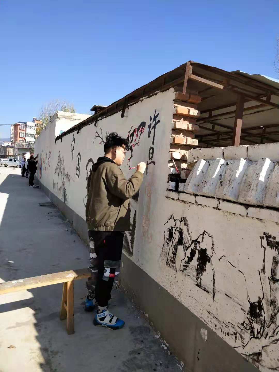 在马山口镇的四天里,美术学院的老师和学生们顶着恶劣天气,将中国梦、文明礼仪、勤劳节俭、孝老爱亲、村规民约、移风易俗、富民政策等内容融进墙绘作品,简洁的文字配以生动的画面,构成文化墙丰富的内涵,改善了马山的村容村貌,提升了马山的乡村文化品位。
