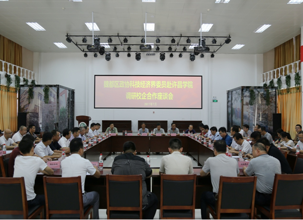 7月10日下午,魏都区政府、魏都区政协经科委共同组织科技经济界政协委员及魏都区部分科技型企业代表20余人,来到我校进行调研,并就产学研合作对接进行洽谈。我校“双百工程”魏都区挂职干部翟广辉副区长、魏都区政协张剑哲副主席,魏都区政协经科委魏振岭主任,魏都区科技局朱明志局长,魏都区服务业发展局张俊安局长,魏都产业集聚区管委会赵正印副主任,魏都区科技局张超民副局长,我校校地合作办公室郭超峰主任等领导出席,我校相关院系负责人、教授、博士等参加,对接会由我校“双百工程”挂职干部许昌市科技局许志红副局长主持。