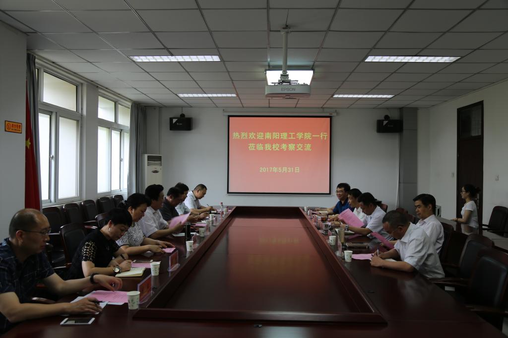5月31日,南阳理工学院党委副书记秦鹏鸣、副校长陈世云一行9人到我校考察交流校企合作工作。我校党委副书记孙海、副院长郑直接待了来访客人,校地合作办公室主任郭超峰,副主任马金柱参加了座谈交流。