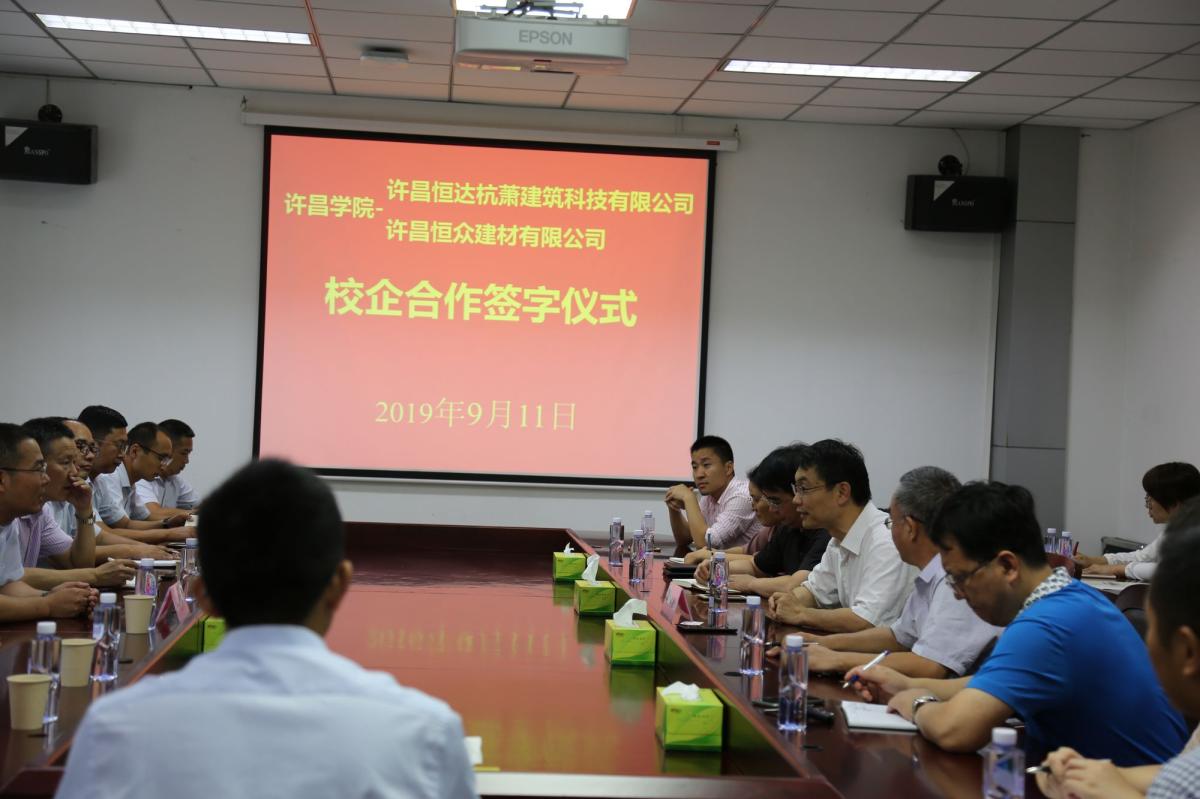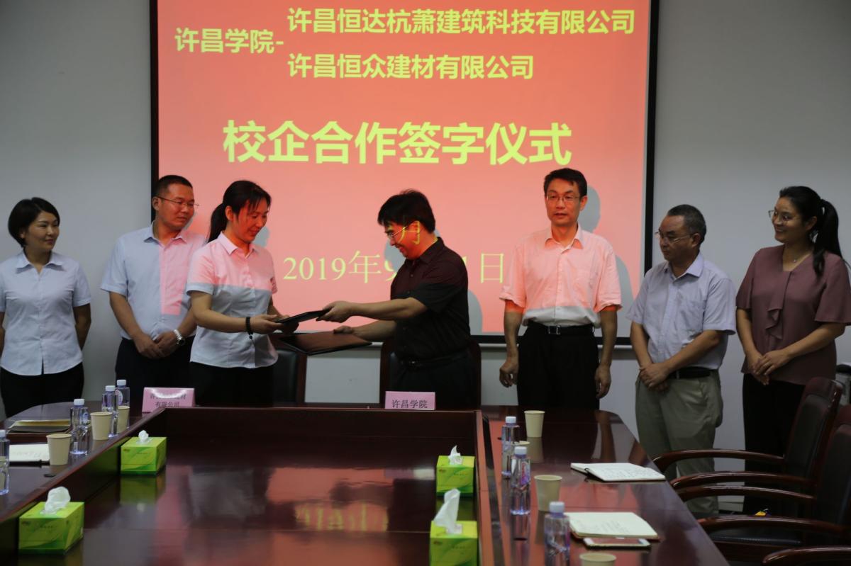 校地合作办公室主任郭超峰和许昌恒达杭萧建筑科技有限公司叶广宇、许昌恒众建材有限公司王艳玲分别代表双方签订了产学研战略合作协议。