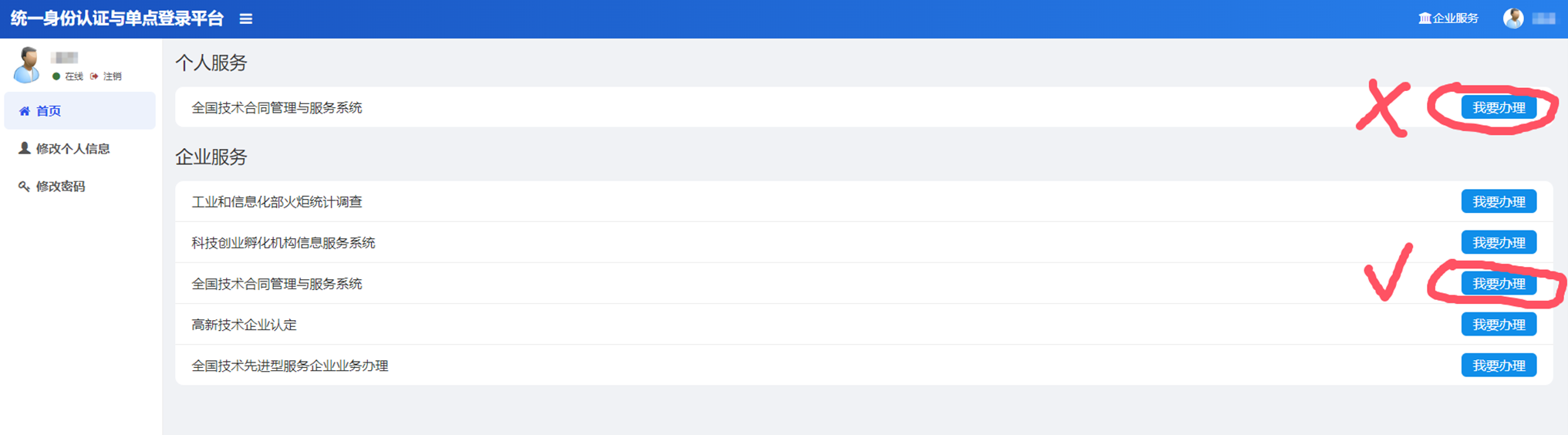 3、选择“企业服务”栏目下面的“全国技术合同管理与服务系统”,点击右侧“我要办理”。(注意:不要选择“个人服务”下面的“全国技术合同管理与服务系统”)