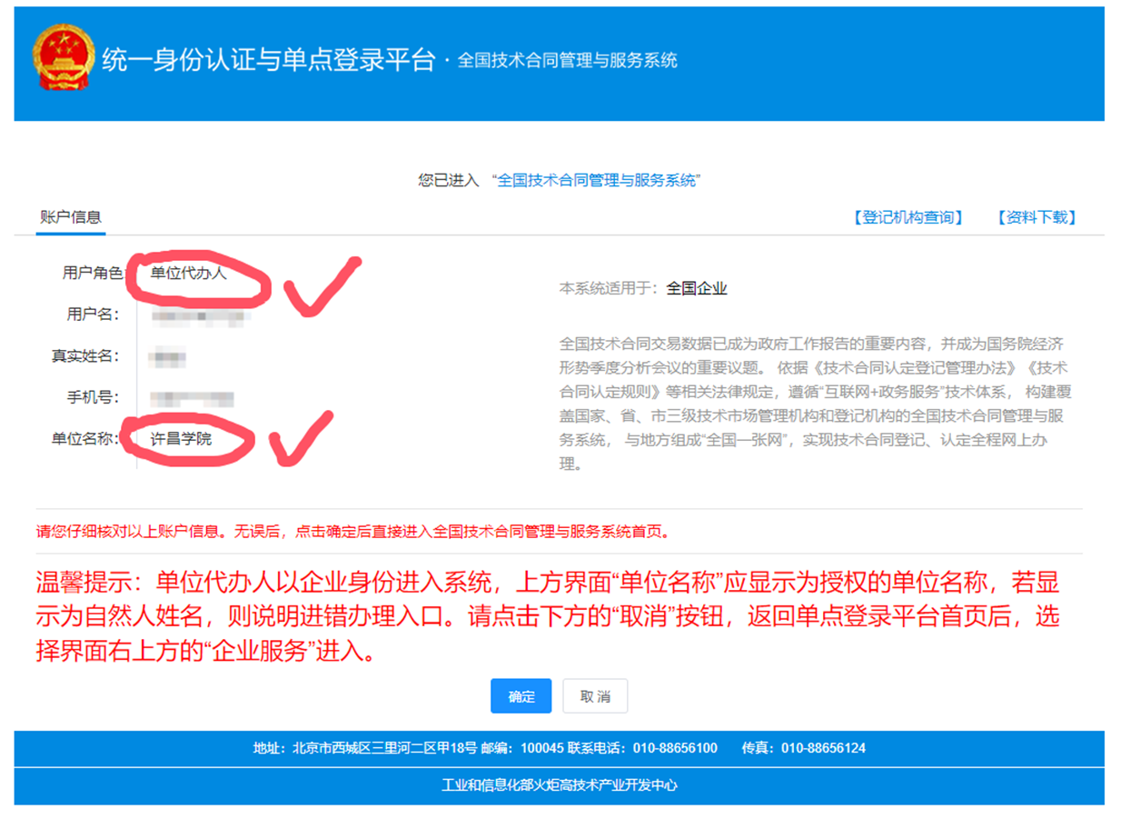 4、进入“全国技术合同管理与服务系统”,确认用户角色为“单位代办人”(不能是“自然人”),单位名称是“许昌学院”(不能是自己名字)。点击确定。